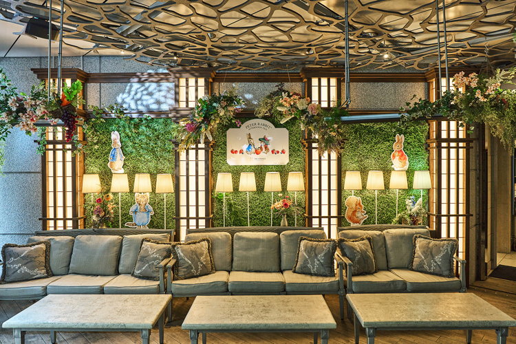 ピーターラビットの世界を色とりどりの花やフルーツで表現したテラス席では、ピーターと仲間たちがお出迎え!
